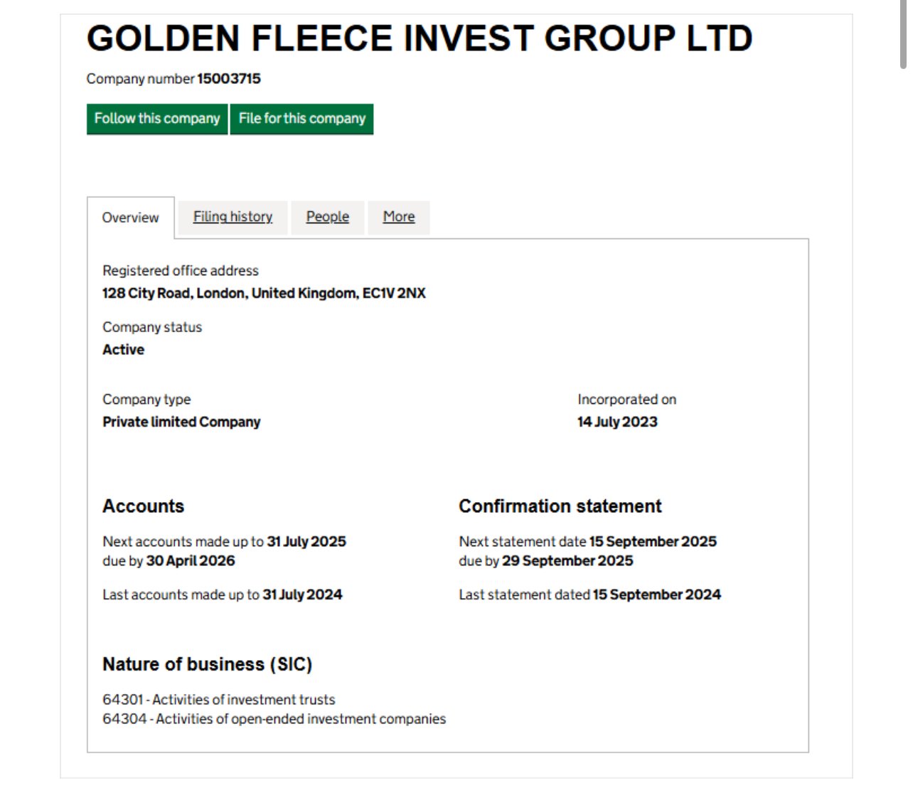 The legal entity Golden Fleece Invest Group LTD is registered in the United Kingdom, according to the official extract.