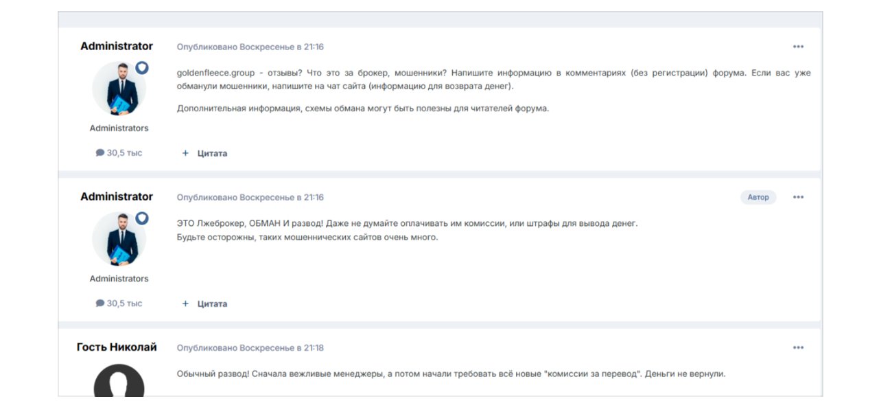Such reviews about Golden Fleece Group may turn out to be fake, since they cannot be verified. We were able to find other comments in which traders talk about blocks and scams.