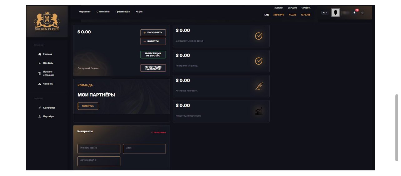 After registration an investor's personal account opens. There you can choose contracts to invest in Golden Fleece Invest Group, top up the balance or send a withdrawal request.