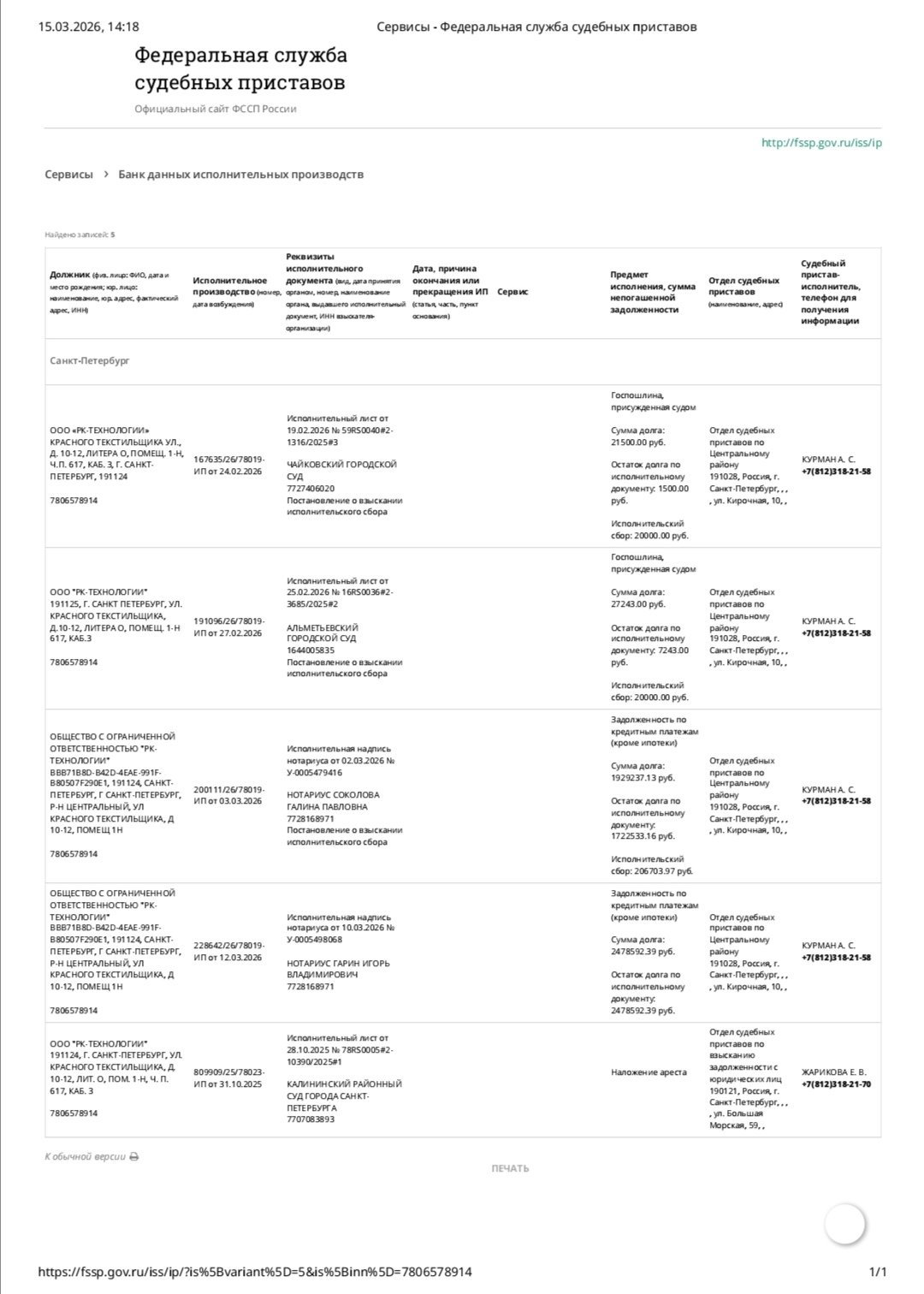 If you thought you had a rough patch in life, first look at the FSSP database screenshot for the St. Petersburg company "RK TECHNOLOGII". The guys clearly confused their business plan with a list of sins for confession.