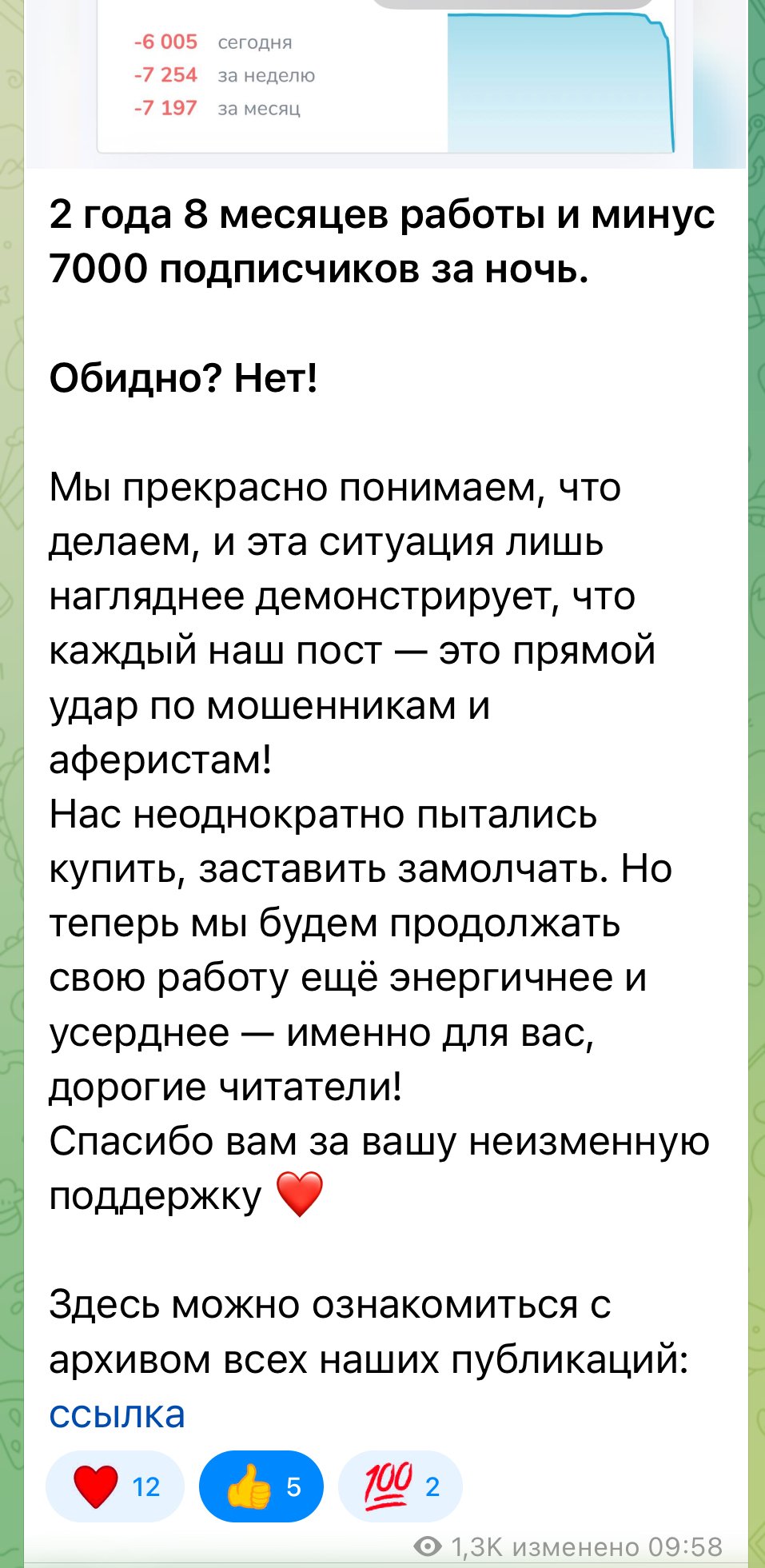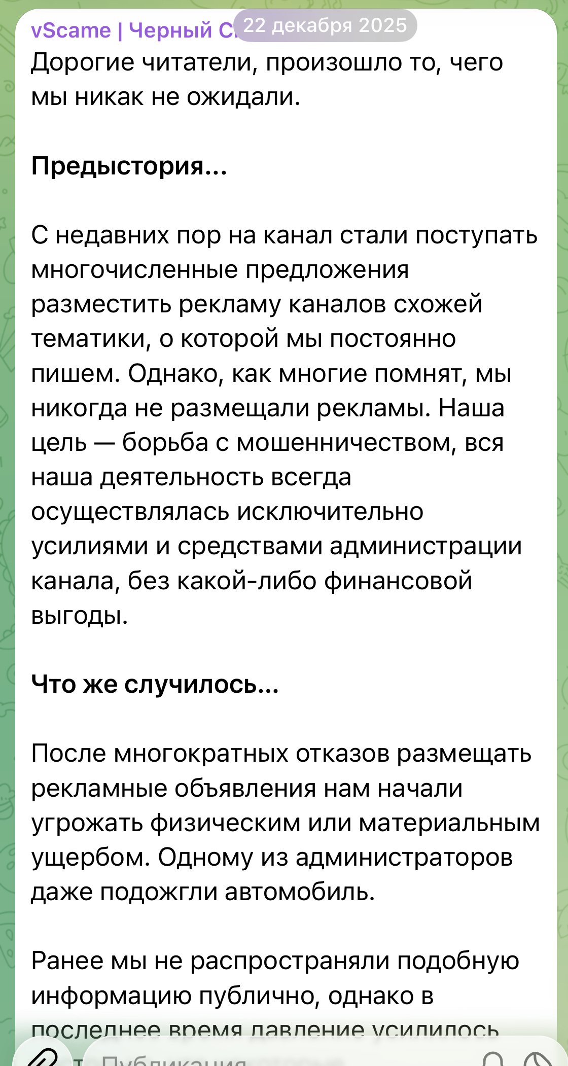 Here’s how the situation developed: we accumulated enough information and facts to dictate terms ourselves and calmly ignore the threats of scammers. Most participants in our channel remain here purely out of their own desire and enthusiastic impulse, not for material gain. Many, after the events, refused to take risks, although they essentially acted as simple editors.